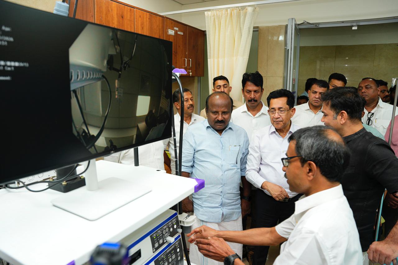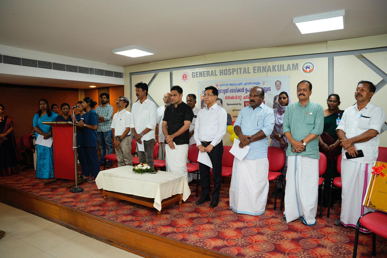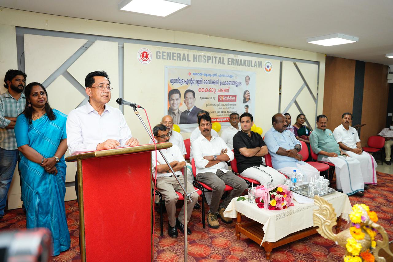 The equipment was handed over by Dr. Joy Alukkas, Chairman & MD, Joyalukkas Group, to Shri Hibi Eden, MP, in the presence of Shri T. J. Vinod, MLA, Dr. Shahirsha R, Superintendent of Ernakulam General Hospital, Dr. Paulose George, Gastroenterologist, and other dignitaries.