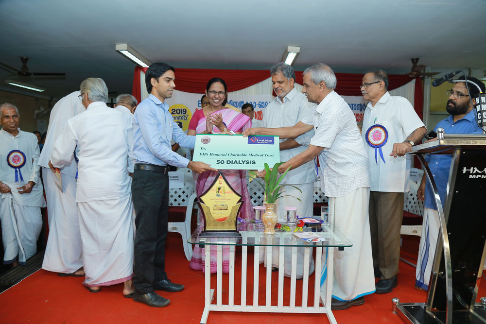 In a function conducted at EMS Hospital, wherein Mrs. K K Shylaja, Kerala Health Minister was present, our Perinthalmanna Branch Manager Sri. Anvar handed over a cheque for Rs 25000/- to Mr P.P. Vasudevan, Hon. Secretary, EMS Memorial Charitable Trust in support of the poor renal patients. This is over and above the regular issue of 100 dialysis kits given free from our Branch at Perinthalmanna. This kind act of Joyalukkas Foundation was appreciated by most of the VIPs and the audience as well.